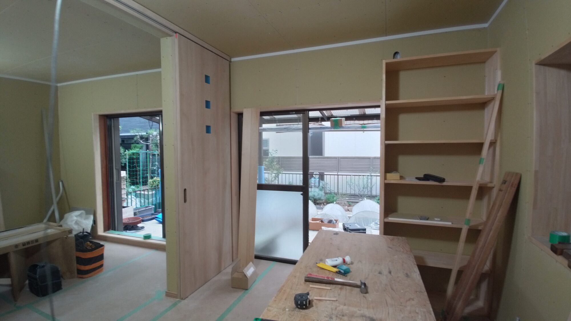 壁・天井の下地、押入れの棚、造作家具の作成、建具の建て込みなどが完了しました!