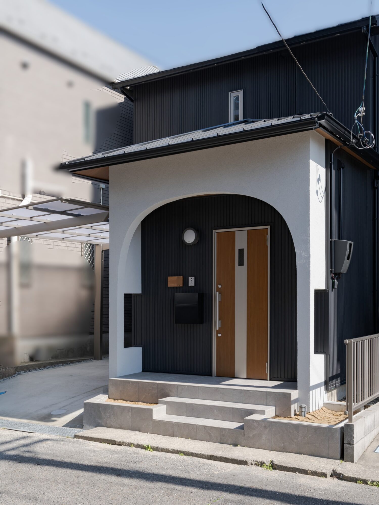 玄関周りのデザインは元の姿を再現して塗壁仕上げです。
